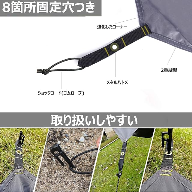 【便利な固定穴】テントシートに固定穴ついてます。ハトメも補強します。ペグで固定可能です。ハトメにショックコードも搭載し、取り付けは簡単です。ポールとガイロープあれば簡易タープとしても使うことが出来ます。
