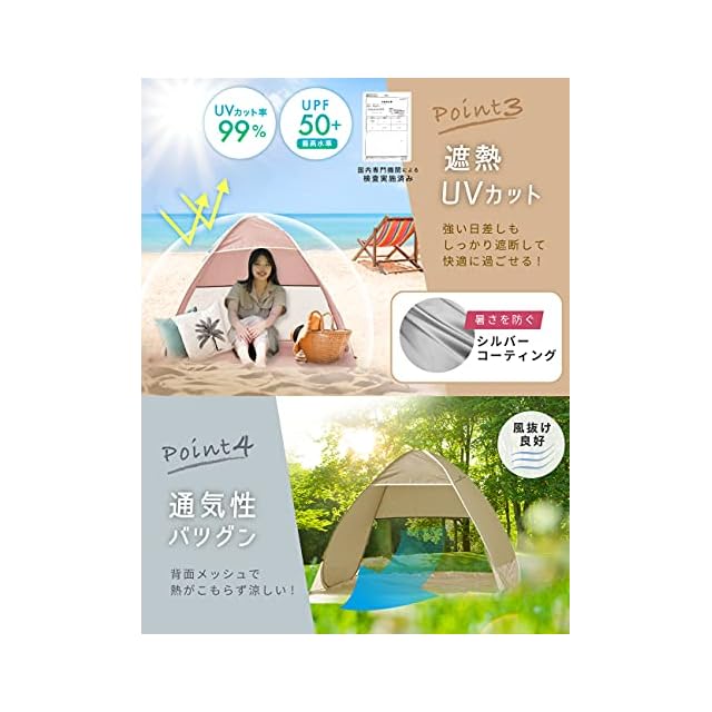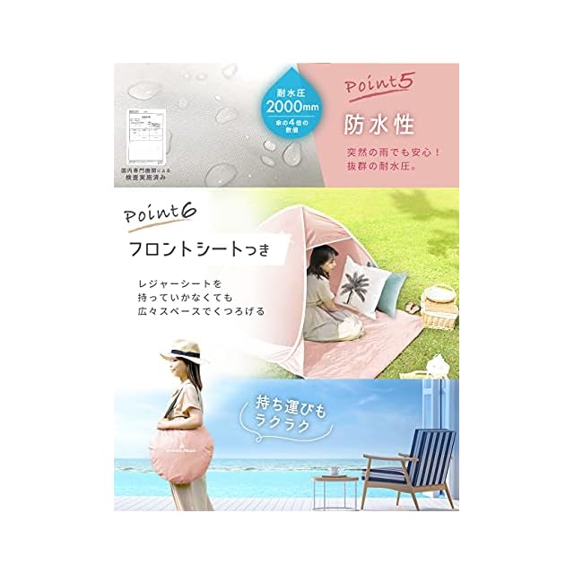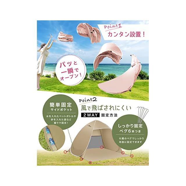 【組み立てがシンプル&スピーディー】 とことん使いやすさを追求し、テント組み立てに掛かる時間と煩わしい手順を大幅カット!専用ケースから取り出して手を放せば、5秒でぱっとテントが自動的に開きます。また、簡易シートも本体と一体になっているのでわざわざレジャーシートなどを敷く必要がありません。