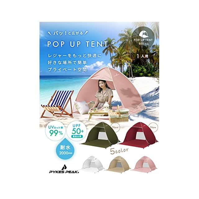 【イマドキカラーでお洒落にレジャーを彩る2~3人用ポップアップテント】 ビーチやピクニックなど、様々なレジャーシーンで映える明るいカラーのテントがアウトドア用品のニュースタンダードとして登場! 本製品の特長は、なんといってもアウトドア用品には珍しい「5色のカラーバリエーションと製品に兼ね備えられた高い機能性です。 「長く使う物だからこそ、充実の機能性でお洒落なアイテムを選びたい!」そんな皆さまの声を実現しました。 組み立ても片付けも時間がかからず、暑さや風対策はもちろん、高い防水&透湿性も持ち合わせた”優れモノ”な製品です。 2~3人用のテントですので、大切なご家族やご友人というような多人数のお出かけ用に、または今人気のソロキャンプ用やおうちキャンプ用など、大人からお子様までお好みの使い方が叶います。