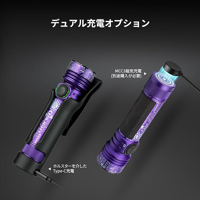 [2種類の充電方式で柔軟に対応] 本製品はType-C充電(ホルスター併用)とMCC3充電(別売)の2つの充電方法をサポート。お客様のライフスタイルや使用シーンに合わせて、最適な充電方法を選べます