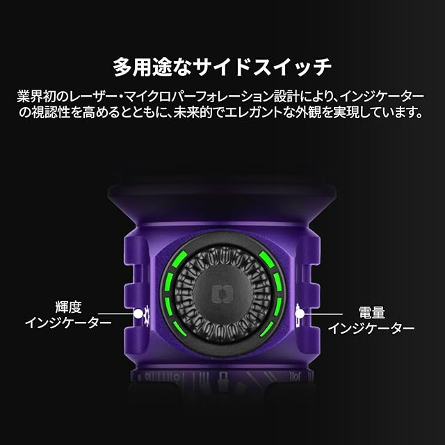 [操作性抜群のユーザーフレンドリー設計] 大型の金属製サイドスイッチを採用し、操作性を大幅に向上。滑らかな無段階調光が可能で、快適な使用感を実現しました。スイッチには明るさとバッテリー残量が表示され、キャンプや登山などのアウトドア活動でも使いやすさを追求しています