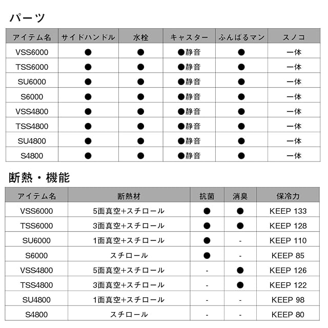 断熱材:真空パネル3面+スチロール / 保冷力:KEEP 128