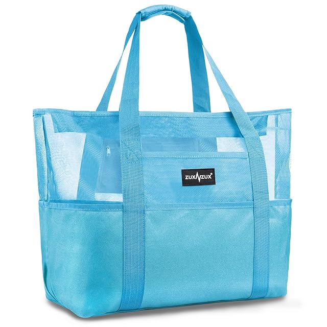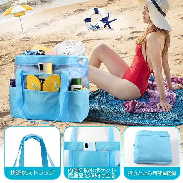 [ZUXNZUX] ビーチバッグ プールバッグ 軽量 38L 大容量 防水 自立式 折り畳み可能 メッシュバッグ ビーチ/ショッピング/水泳/ジム/スパ/温泉/旅行用(ブルー新しい)