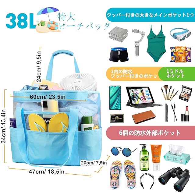 【超大容量】究極のビーチ パル、38L メッシュ ビーチ バッグは優れたデザインで十分な容量があり、ビーチでの日々の必需品をすべて簡単に収納できます。 バッグには、すべてのアイテムにすばやくアクセスできるように、6 つの耐水性と耐砂性の特大の外部ポケットが付いています。 さらに、砂に強い底面と防滴性の内側のジッパー付きポケットにより、貴重品を安全に保管できます。 実用的であるだけでなく、スタイリッシュで耐久性があります。 このビーチバッグでビーチでの一日を完璧にしましょう。