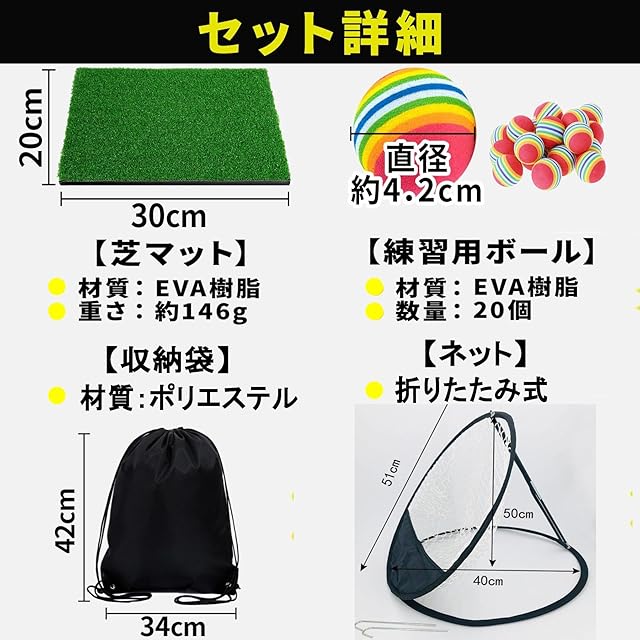 ✅【製品情報】サイズ:人工芝300mm×200mm×18mm (人工芝10mm・SBRスポンジ8mm) ・アプローチネット500mm×500mm×400mm・ライン入りカラーボール20個 直径42mm EVA ・ポリエチレン製収納袋1枚 420mm×320mm ※モニターの環境等により、色の見え方に若干の違いがある場合がございます。