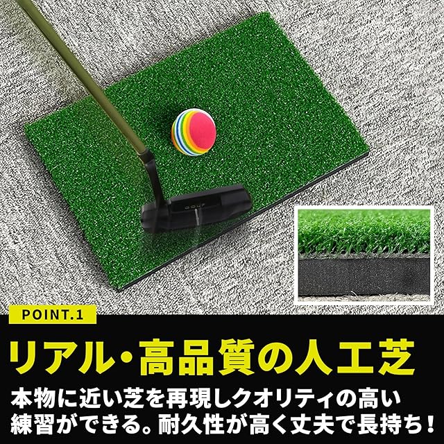 ✅【衝撃吸収!自宅の床を傷付けない、厚みのある芝マット】芝風マットの裏面には滑り止め加工を施し、フローリングの上でショットしてもマットがズレにくい仕様。人工芝の下には厚みのあるスポンジを使用し、人工芝とスポンジによる2層構造により打った際の衝撃を吸収しやすい仕様。