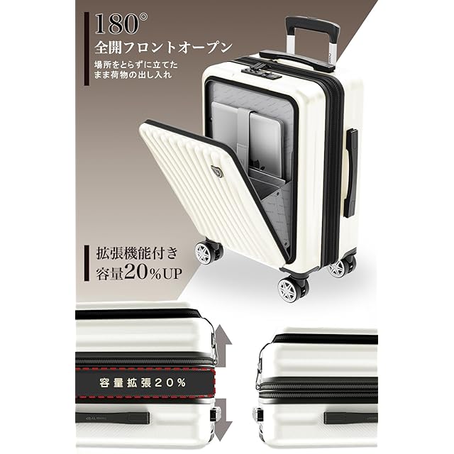 【フロントオープン&拡張機能付き】立てたまま荷物の出し入れができる便利なフロントオープンスーツケースです。15.6インチまでパソコンやタブレット、パスポートなど荷物に合わせた細かなポケットがあり、空港や新幹線の中、旅の途中でも、前ポケットから出したいものを簡単に取り出すことができ、子連れの方やビジネスシーンでも活躍しています。スーツケースの拡張ジッパーを開けるだけで、マチ幅が5cm広がり、容量が20%増加。必要なときにすぐにスペースを拡張でき、旅行の柔軟性を高め、効率的に荷物を収納できる便利な機能です。