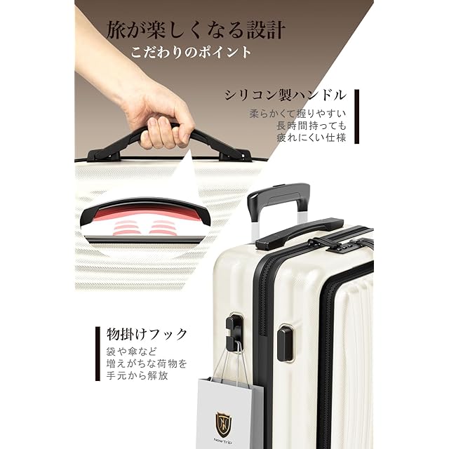 【安心のTSAロック&物掛けフック付き】世界基準のTSAロック搭載しています。アメリカ空港(グアム・ハワイ・サイパン含む)では必需品です。ダイヤル式ロックなので鍵を無くす心配がないのも魅力です。また、キャリーケースのボディ側面に手提げ袋など掛けられるフックを搭載しています。外出中増えがちな荷物を、手持ちから解放してくれる便利機能です。