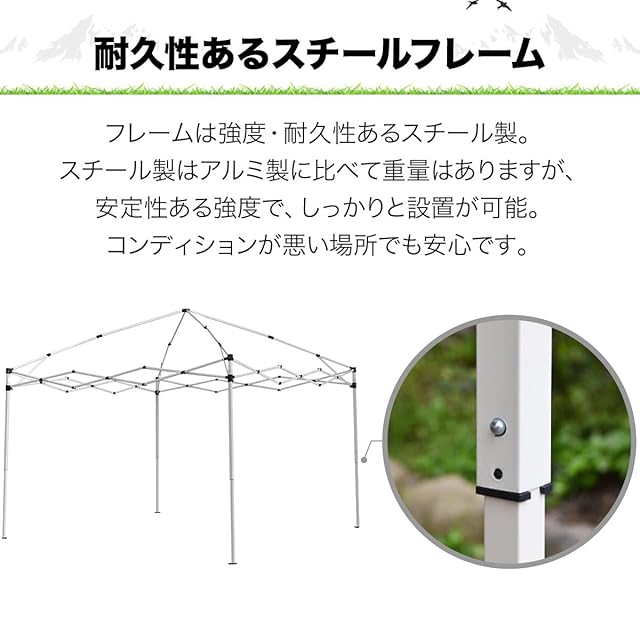 サイズ 組立時 : (約)2.5m×2.5m×1.65m / 2.37m / 2.45m 収納時 : (約)22cm×22cm×114cm 本体重量 (約)12kg 材質 フレーム : スチール 生地 : ポリエステル