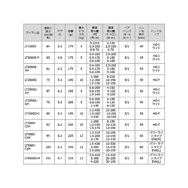 【標準糸巻量ナイロン(lb-m)】:14-310/20-250/30-150