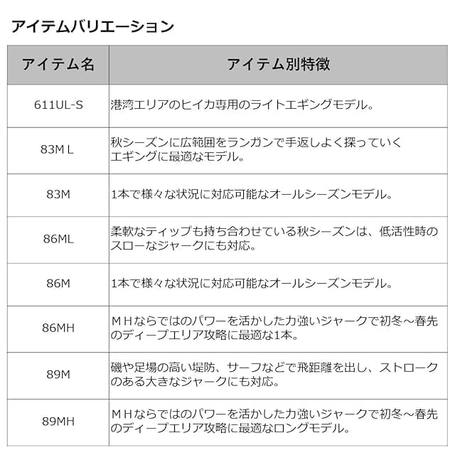 89MH:キャスタビリティ、パワー共にバランスの取れたレングスで3.5号~4.5号エギサイズの使用をメインに開発。MHならではのパワーを活かした力強いジャークで初冬~春先のディープエリア攻略に最適な1本。バット部はX状にカーボンテープで締め上げた「ブレーディングX」を採用し、軽快なキャスト、シャクリといったエギングロッドの基本性能をしっかりカバーしたモデル。