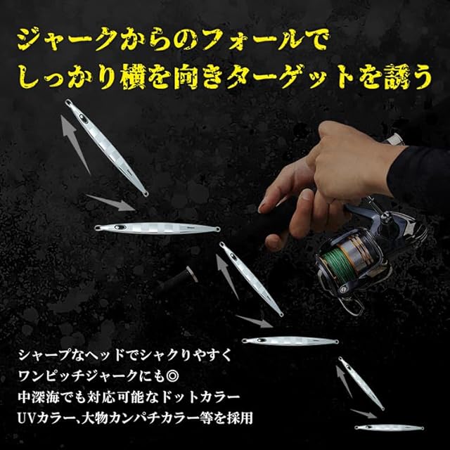 ◇ジャークからのフォールでしっかり横を向きターゲットを誘う。◇シャープなヘッドでシャクりやすくワンピッチジャークにも◎◇中深海でも対応可能なドットカラーUVカラー、大物カンパチカラー等を採用。