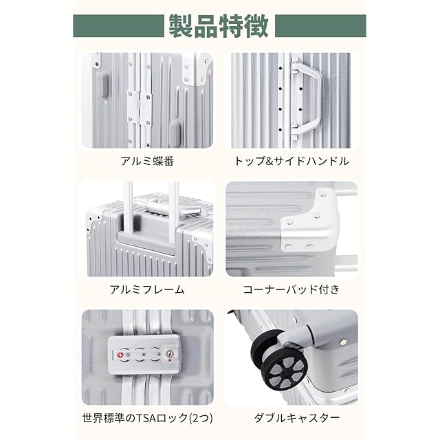 【軽量で、大容量】人気のアルミフレームを採用しており、ビジネスでもカジュアルでもシーンを選ばずに使用できます。本体は耐久性に優れたABS樹脂とPC製で、密閉度の高いアルミフレームにより、ファスナーレスとなっております。【注意】フレームの材質だけがアルミニウムです。スタイリッシュでありながら、5サイズの重量はわずか3~5KG、それでいて容量は35ℓ~90ℓと国内旅行や小旅行には十分な大きさです。