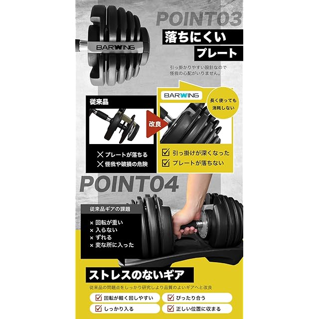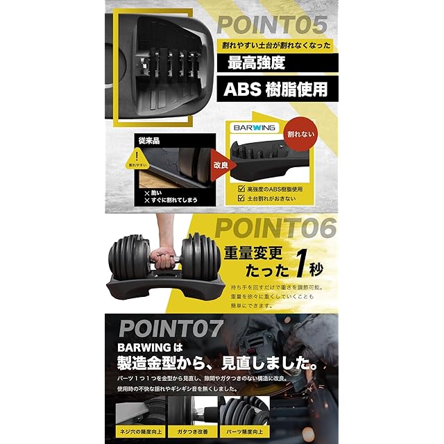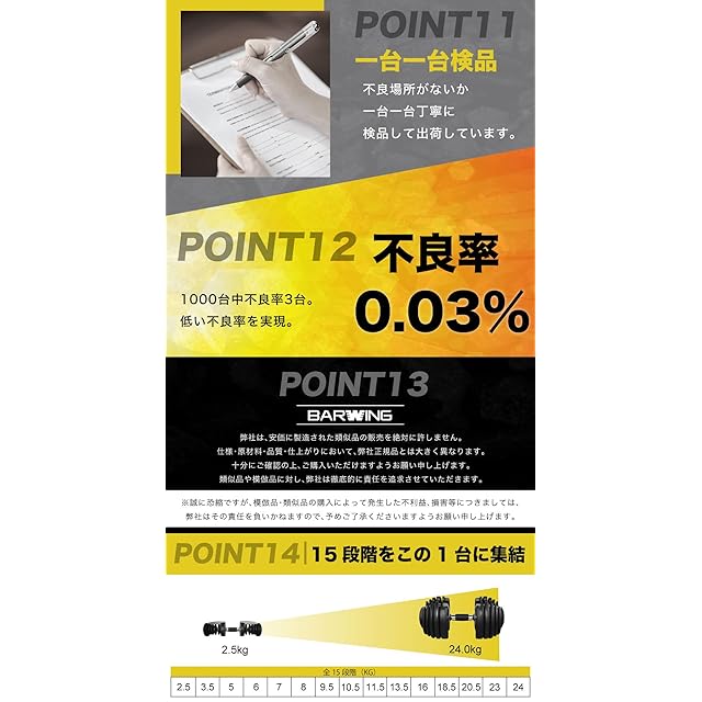 【初心者から上級者まで対応・15段階の重量調節】BARWING可変式ダンベルは、2.5kg〜24kgまで15段階で調節可能。この1台で幅広いトレーニングに対応できます。