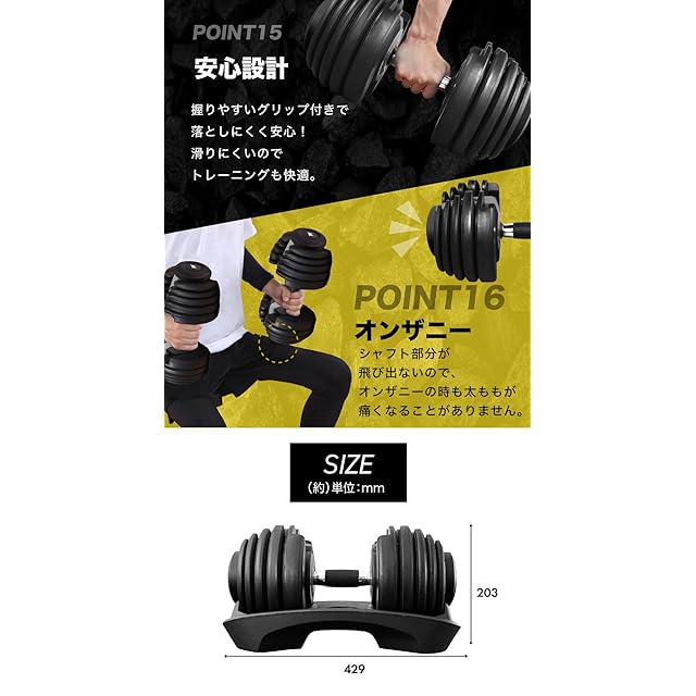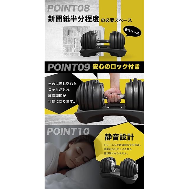 【安全上の注意】ダンベルを持ち上げた後、ダイヤルがしっかりロックされていることを確認してください。使用後は必ずベースに戻してください。※2個セットのダンベルは2個口で配送されます。