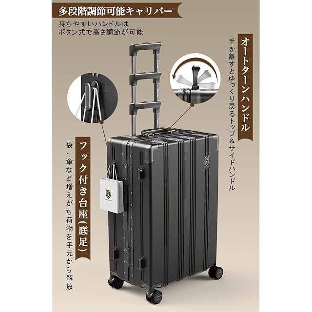 【多段調節キャリバー&物掛けフック&オートターンハンドル】アルミ合金製の超軽量のキャリバーは伸縮可能で、ご自分の身長に合わせて、最適な高さに調節できます。キャリーケースのボディ側面の台座に手提げ袋など掛けられるフックを搭載しています。外出中増えがちな荷物を、手持ちから解放してくれる便利機能です。トップとサイドのハンドルは、手を離すと自然と元の位置に戻るオートリターン機能が付いています。