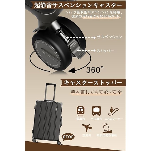 【超静音キャスター&ストッパー付き】360度回転可能のダブルキャスターにショック吸収サスペンションを搭載し、段差のあるところを走行する際の衝撃を吸収しより高い静音性を発揮します。従来の走行音から約30%カット!早朝と深夜でもストレスなくスムーズな走行が可能に。また、キャスターにストッパーが付いているため、電車内などスーツケースが自走してしまう環境でもストッパーをかけておくだけでスーツケースが動き回るのを防ぎます。