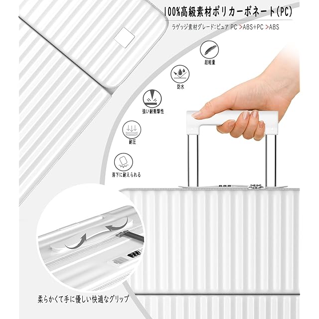 【丈夫かつ軽いPC素材&TSAダイヤル式ロック】表面素材は高耐衝撃性を持つPC(ポリカーボネート)を100%使用。高弾性で、変形しにくい。ABS素材を採用した市販品より頑丈で耐久性に優れ、ABS+PCスーツケースより軽量で持ち運びやすい。PC 素材は、現在市場で最も一般的に使用され人気のあるハードシェル ラゲッジであり、防水性、耐摩耗性、スタイリッシュさ、耐衝撃性、落下耐性を備えています。世界基準のTSAダイヤル式ロックが搭載されて、外出がより安全に。※鍵は航空会社検査専用のため本製品には付属しておりません。