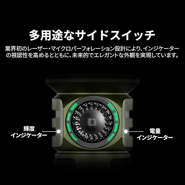 [操作性抜群のユーザーフレンドリー設計] 大型の金属製サイドスイッチを採用し、操作性を大幅に向上。滑らかな無段階調光が可能で、快適な使用感を実現しました。スイッチには明るさとバッテリー残量が表示され、キャンプや登山などのアウトドア活動でも使いやすさを追求しています