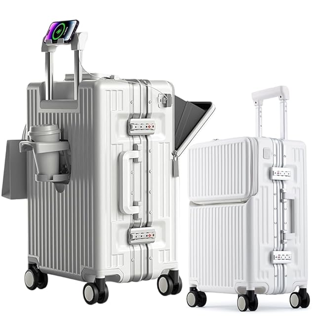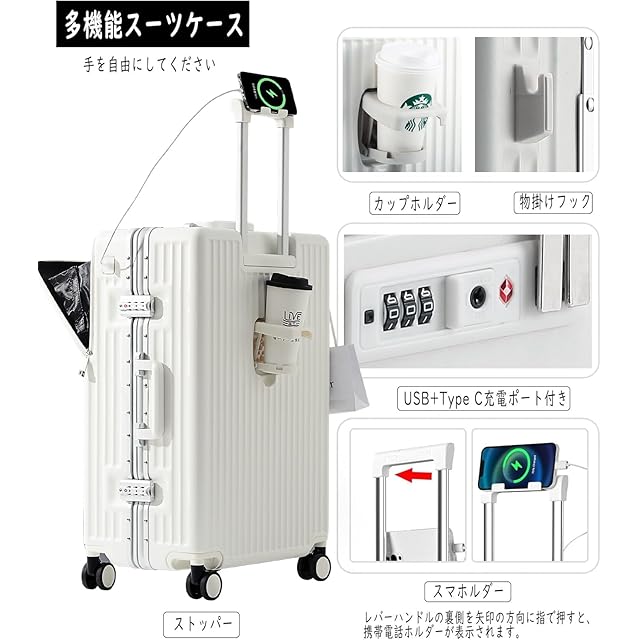 [lanbao] アルミフレームスーツケース 多機能フロントオープン キャリーケース ストッパー付き 機内持ち込み キャリーバッグ 携帯スタンド USBポート付き カップホルダー付き 隠しフック機能 超軽量 耐衝撃 静音 360度回転 ダブルキャスター アルミフレーム ピュアPC材質 大容量 TSAロック搭載 (ワイト, Mサイズ /65L (4~7泊))