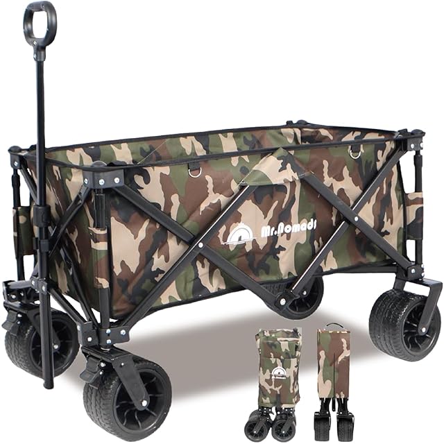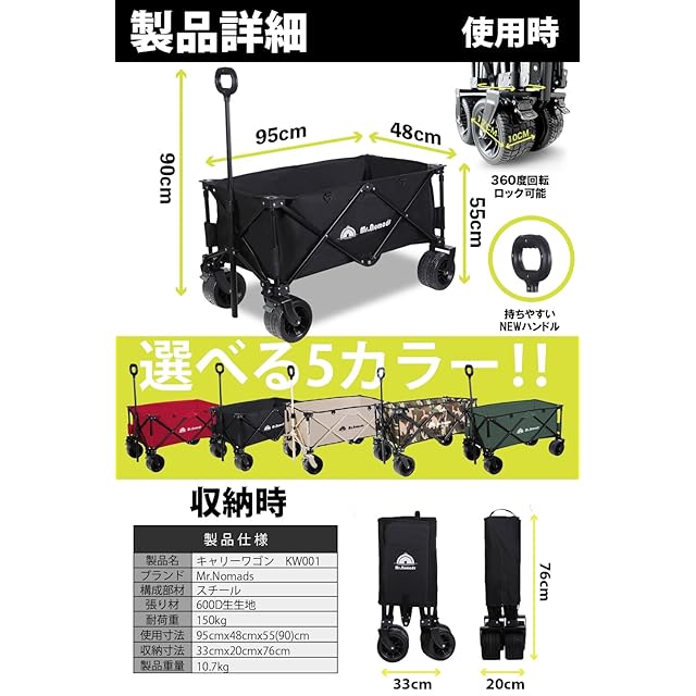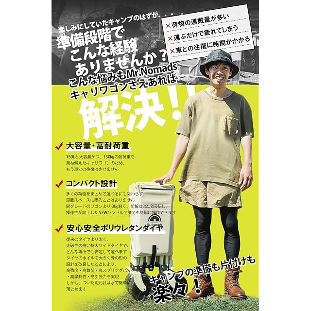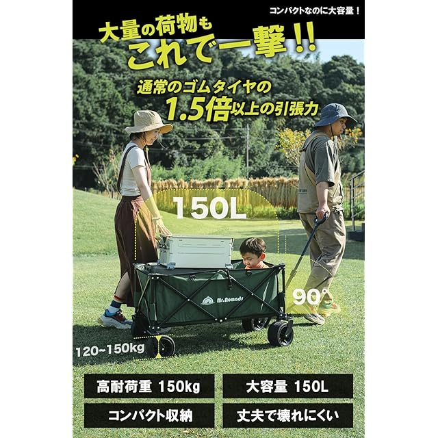 MR. NOMADS 【ラグビー日本代表使用】 キャリーワゴン キャリーカート 4輪 こども乗せれる 折り畳み 軽量 大容量 150L コンパクト 大きいタイヤ 頑丈 耐荷重150kg 自立収納 ワンタッチ収束式 アウトドアワゴン キャンプワゴン カート 子供 (KW001 meisai) リアゲートなし