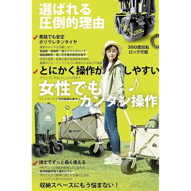 ✅【悪路でも安定するポリウレタンタイヤ】高強度、高スプリングバック、高耐摩耗性、高い引裂き耐性などの特性を有したポリウレタンタイヤを採用。重い荷物をのせて段差のある場所、芝生や凸凹道、ぬかるみ、舗装路、砂利道、砂浜などでも安定して進めます。
