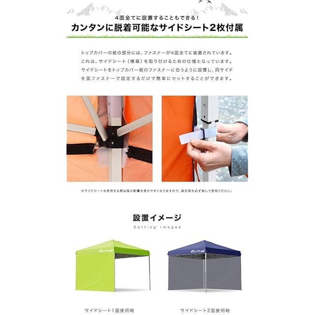 付属品 ・ロープ : 4本 ・ペグ : 12本 ・専用サイドシート : 2枚 ・専用収納ケース ・取扱説明書(日本語・英語) 使用上のご注意 【生地の色味について】 生産時期により購入されたシートとテント本体の色味が若干異なっている場合があります。申し訳ありませんが、ご了承の上ご購入をよろしくお願いいたします。 【荒天時使用について】 本テントは耐水加工が施されておりますが、雨天時や風が強い荒天時にはペグで地面に固定しても突風や瞬間的な豪雨などでテントが破損する場合がございますので、使用されませんようお願いします。風・雨などの自然現象による破損につきましてはの対象外となりますのでご注意ください。