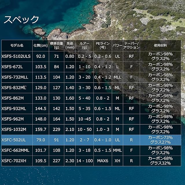 全長(ft/cm)5'0"/152.5●仕舞(cm)79●標準自重(g)88●先径(mm)1.2●ルアー(g)2 - 7●フロロカーボンライン(lb)4 - 8●PEライン(号)0.4 - 1.0●パワーUL●テーパー/アクションR●使用材料カーボン73%,グラス27%