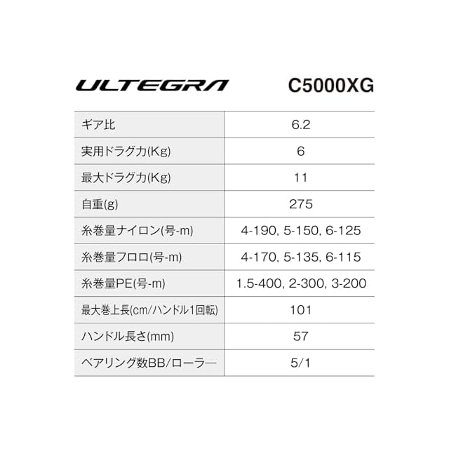 糸巻量:ナイロン(号-m) 4-190、5-150、6-125 / フロロ(号-m) 4-170、5-135、6-115 / PE(号-m) 1.5-400、2-300、3-200