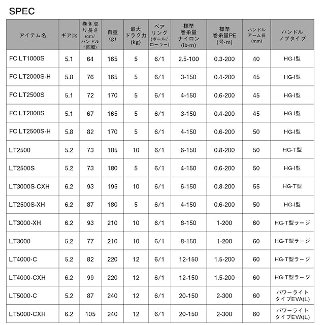 標準巻糸量ナイロン(lb-m):8-150 , 標準巻糸量PE(号-m):1-200 , ハンドルアーム長(mm):60