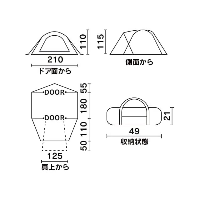 【使用サイズ】インナーテント/約210×180×110(h)cm 収納時:約φ21×49cm(重量:5.2Kg) バイクツーリングなどでも積みやすいコンパクトサイズとなっています。
