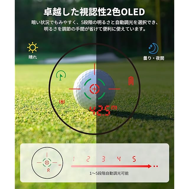 【自動調光機能】周囲の光に応じて赤緑2色OLEDディスプレイの明るさを自動的に調整されることで、プレイ中の視認性が向上し、ユーザーの負担を軽減してゴルフに集中し、プレーをよりスムーズに楽しむことができます。