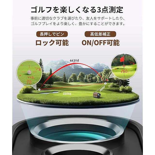 【小柄ながら高性能】前作よりも小型化・軽量化を実現しながらも、ゴルフに必要な機能をしっかり搭載しています。カートから目標物を事前に測定し、最適なクラブを選べる「3点間距離測定モード」に高低差補正のON/OFF切替も可能です。もっと快適なゴルフをサポートします。