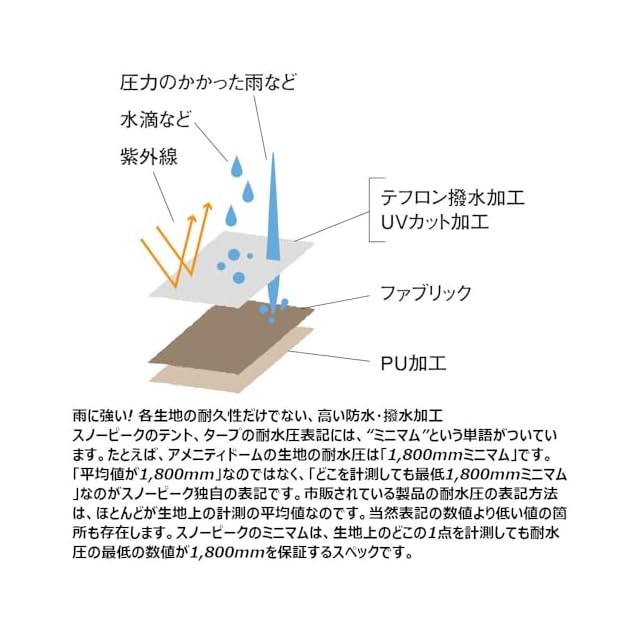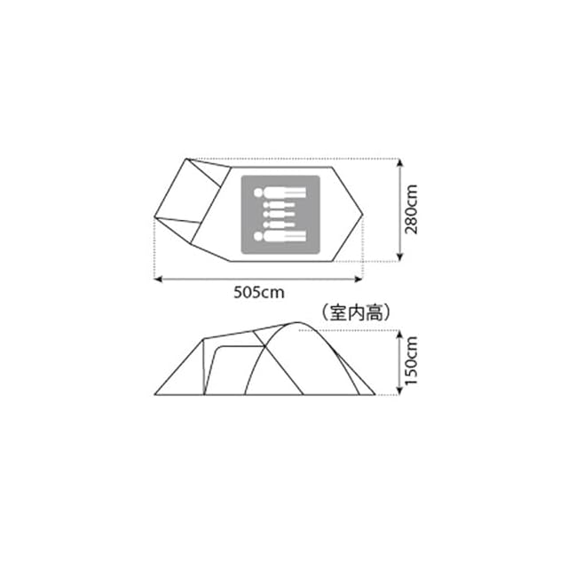 材質:フライシート/75Dポリエステルタフタ・PUコーティング耐水圧1,800mmミニマム・撥水加工・UVカット加工、インナーテント/68Dポリエステルタフタ(ウォール部)、210Dポリエステルオックス・PUコーティング耐水圧1,800mmミニマム(ボトム部)、フレーム/A7001、A6061(Φ12.8mm、Φ12mm、Φ11.8mm)