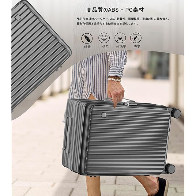 【高品質なボディ&丈夫かつ軽い素材】軽さと堅固性に優れているPC (ポリカーボネート)とABS樹脂を配合したボディ。女性でも持ち上げられる軽さですが、衝撃に強く中の荷物をしっかりと守ります。 衝撃にも強く、無数に細かい凸凹が傷をつきにくくしてくれます。ケースのメンテナンスに関するヒント: 傷やへこみを避けるため、鋭利なものでスーツケースを傷つけたり、激しい摩擦や衝突を与えたりしないように注意してください。