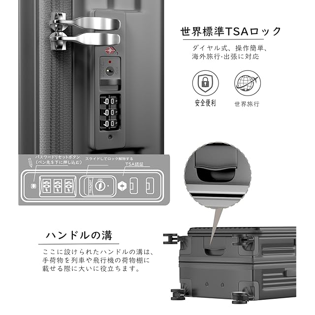 【三段調節キャリバー・世界基準の安全性】超軽量のアルミニウム製キャリバー、高さ三段階調節、ご自分の身長に合わせてスムーズに調整が可能です。耐振性に優れるデザインで荷物を引きかける時、しっかりしています。また、滑りにくいソフトハンドルで長い時間の手提げでも手は疲れません。海外旅行には欠かせないTSAダイヤル方式のロックが搭載されており、外出がより安全になります。※鍵は航空会社検査専用のため本製品には付属しておりません。