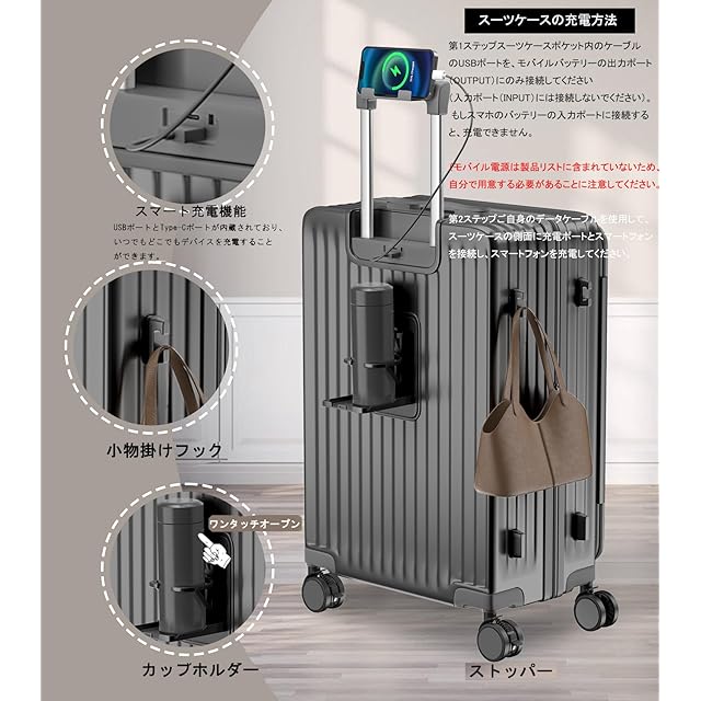 【多機能・キャスター ストッパー付き ・USB+Type C充電ポート付き ・カップホルダーとスマホルダーを付く】走行中の揺れる電車内でもストッパー(ブレーキ)機能でピタっと自立。乗降時や座席の離着席時などではすぐにストッパー解除ができるのでスムーズに移動を再開することができます。スーツケースにモバイルバッテリーを収納するポケットがついており、 USB+Type Cポートの充電口が外にあることで、いつでもどこでも充電できます。便利な折りたたみ式ドリンクホルダー付き。バックカップホルダー、ミルクティーカップ、傘いつでも配置でき、旅行をより便利にすることができます。レバーの上部にはスマホルダーが付いているので、フライトの待ち時間に両手が自由になり、外出先でもリラックスできます。
