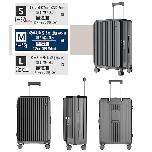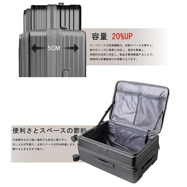【片開き・拡張可能・大容量タイプ】片面開きなので狭い場所でも完全に開けずに出し入れが可能で、占有スペースを50%削減します、開けるときも片手で楽々。ファスナータイプで、マチ幅を5cm拡張するだけで容量が20%UPできる。旅先でお土産が増えても安心です。※拡張時は機内持ち込み不可