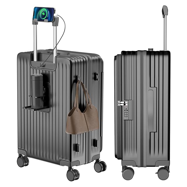 [Vivcon] スーツケース キャリーケース 多機能 片開き 拡張機能付き ストッパー付き キャリーバッグ 携帯スタンド USBポート付き カップホルダー付き 隠しフック機能 超軽量 耐衝撃 静音 360度回転 大容量 TSAロック搭載 旅行 ビジネス 出張 (グレー, Mサイズ /67L (4~7泊))