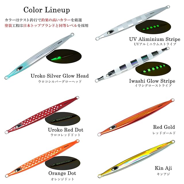 ◇ジャークからのフォールでしっかり横を向きターゲットを誘う。◇シャープなヘッドでシャクりやすくワンピッチジャークにも◎◇中深海でも対応可能なドットカラーUVカラー、大物カンパチカラー等を採用。