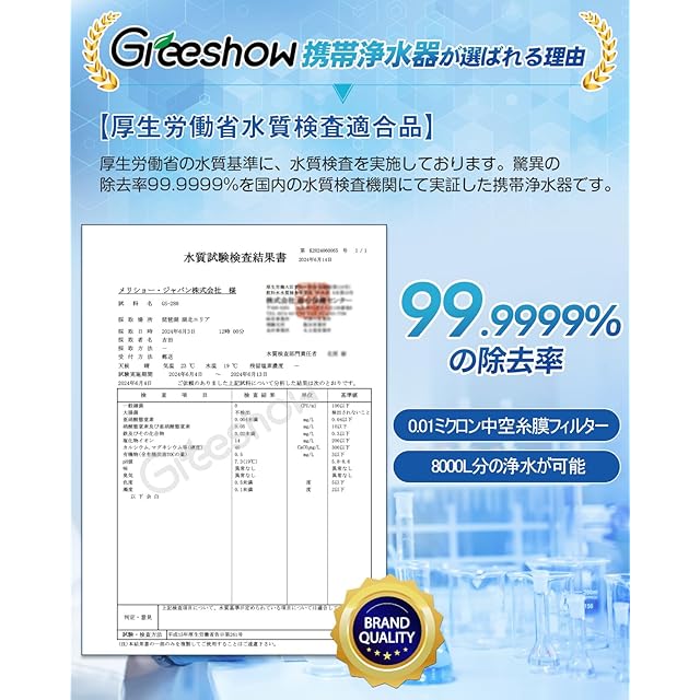 【厚生労働省水質検査適合品】Greeshow 携帯浄水器は厚生労働省の水質基準に照らし合わせて、水質検査を実施しております。プロも信頼するほどの安全品質であることを水質検査成績書にて証明されております。驚異の除去率99.9999%を国内の水質検査機関にて実証した携帯浄水器です。水道水や川、渓流の水、雨水の浄化なども可能です。安心して飲めるほど透き通った清潔な飲料水にろ過することができます。実はミネラルを豊富に含む水道水。そのミネラルは保ったまま、雑菌まで除去できるのはGreeshowだけです。