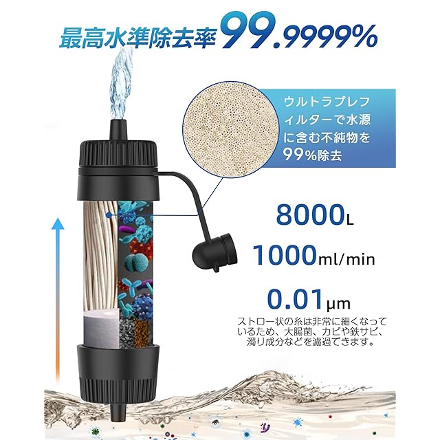 【高効率な浄水】キャンプや旅行だけでなく、地震や津波などの緊急時には、飲料水の確保が最も重要です。しかし、水道水、川やため池の水、お風呂の残り水などを除菌せずに飲むと健康被害を引き起こす可能性があります。この携帯濾過器があれば、中空糸膜フィルターを使用して(粒子、赤サビ、大腸菌、コレラ菌などの雑菌や原虫嚢子、沈殿物な)を除去し、安全で清潔な飲料水に変えてくれます。自然災害は突然やってきるため、防災士は早めの備蓄を推奨しています。