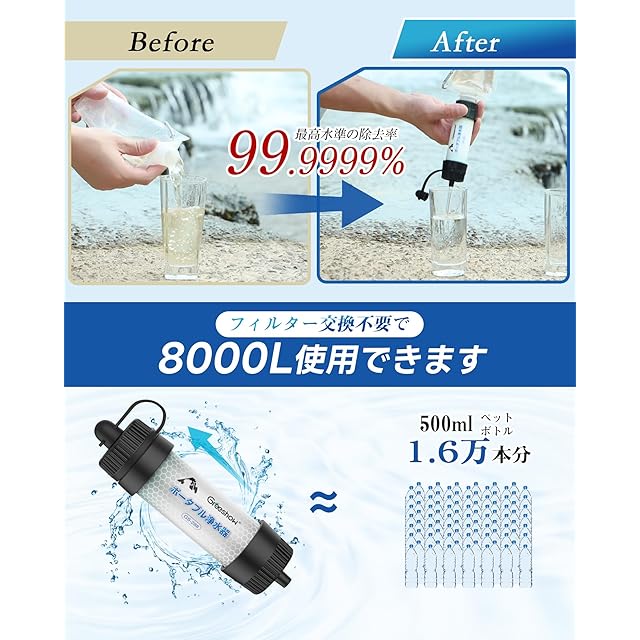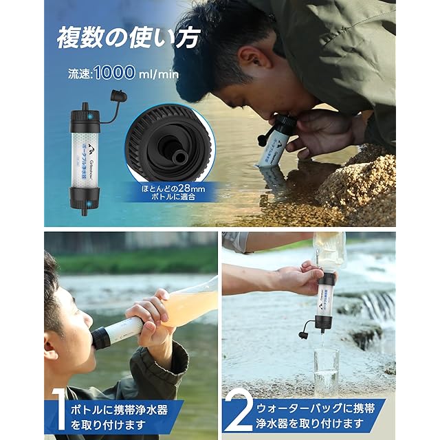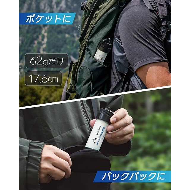【浄水量の増加&軽量コンパクト設計】GS-288携帯浄水器は約8000L分の浄水が可能で、キャンプや登山、サバイバルなどのアウトドア活動に最適な手のひらサイズの浄水器です。持ち運びが簡単で、携帯用浄水器のサイズは3.2cm × 17.6cm × 3.5cmで、重量は62gです。給水バッグが付属しており、防災リュックに1つ入れておくことが推奨されています。アウトドア、キャンプ、登山、釣り、サバイバル、防災、災害時など様々な場面で活躍する携帯用浄水器です。※28mmねじ込み構造に対応。日本国内のほとんどのペットボトルに使用可能です。
