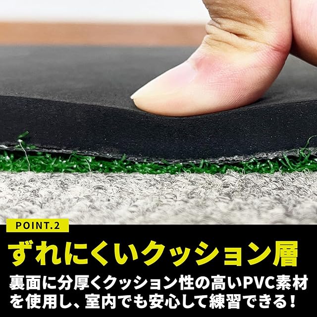 ✅【衝撃吸収!自宅の床を傷付けない、厚みのある芝マット】芝風マットの裏面には滑り止め加工を施し、フローリングの上でショットしてもマットがズレにくい仕様。人工芝の下には厚みのあるスポンジを使用し、人工芝とスポンジによる2層構造により打った際の衝撃を吸収しやすい仕様。
