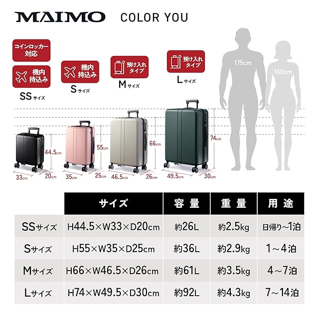 [MAIMO] キャリーケース Mサイズ 日本メーカー 【静か&スムーズ走行で、旅をもっと快適に】 静音キャスター USB 軽量 大容量 61L キャリーバッグ HINOMOTO スーツケース 預け入れ COLOR YOU