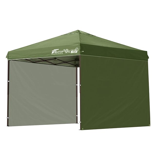FIELDOOR 組立て簡単!! ワンタッチタープテント G03 スチールフレーム 専用横幕/サイドシート2枚付属 風抜けベンチレーション 高耐水加工&シルバーUVカットコーティング 紫外線カット 遮熱 [カーキxブラウンフレーム/2.5m]