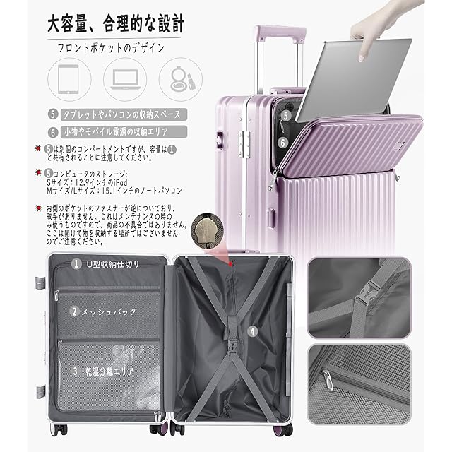 「サイズ」Sサイズの外寸は54.5*35*23cm、重さ:3.96kg 超軽容量、は42リットル、1~3泊に似合います。Sサイズは一部の航空会社だけに適用しますので、事前に航空会社に確認したほうがいいんです。Mサイズの外寸は60*43*26cm、重さ:4.87kg 、容量は65リットル、4~7泊以上。Lサイズの外寸は73*48*30cm、重さ:6.05kg、 容量は97リットル、7泊以上
