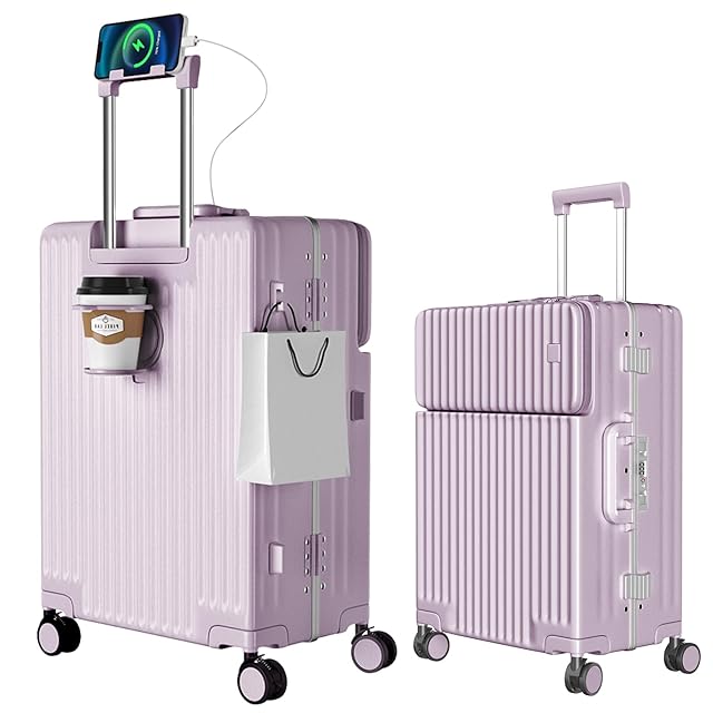 [Ashard] スーツケース 多機能フロントオープン キャリーケース ストッパー付き 機内持ち込み キャリーバッグ 携帯スタンド USBポート付き カップホルダー付き 隠しフック機能 超軽量 耐衝撃 静音 360度回転 ダブルキャスター アルミフレーム ピュアPC材質 大容量 TSAロック搭載 旅行 ビジネス 出張 (パープル, Sサイズ /42L /機内持込 (1-3泊))