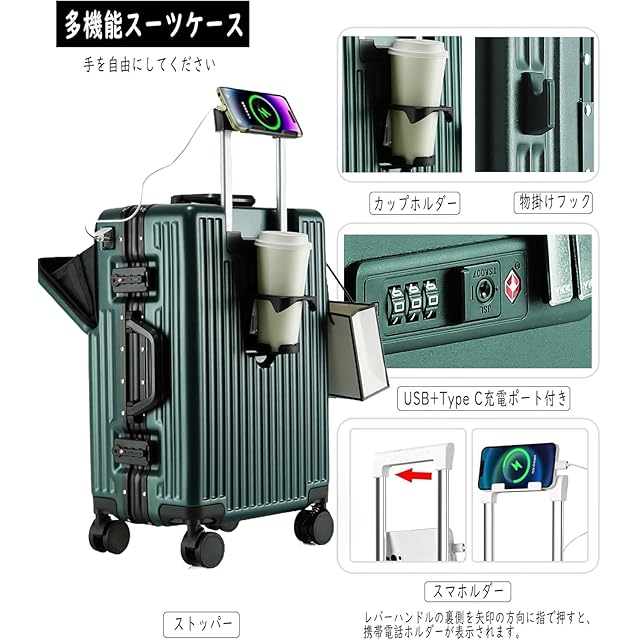 【キャスター ストッパー付き 、USB+Type C充電ポート付き 、 カップホルダーとスマホルダーを付く」 ASHARDフロントオープンシリーズのバージョンアップモデルです。走行中の揺れる電車内でもストッパー(ブレーキ)機能でピタっと自立。乗降時や座席の離着席時などではすぐにストッパー解除ができるのでスムーズに移動を再開することができます。スーツケースにモバイルバッテリーを収納するポケットがついており、 USB+Type Cポートの充電口が外にあることで、いつでもどこでも充電できます。便利な折りたたみ式ドリンクホルダー付き。バックカップホルダー、ミルクティーカップ、傘いつでも配置でき、旅行をより便利にすることができます。レバーの上部にはスマホルダーが付いているので、フライトの待ち時間に両手が自由になり、外出先でもリラックスできます。ありご了承ください。 。付きで万が一、初期不良や自然故障など不具合が応じた場合、(「アカウントサービス」>「注文履歴」>「販売元」>「質問する」注文番号は領収書に替わります。)