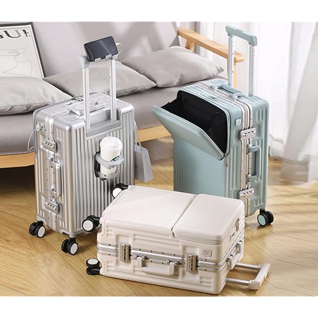 [lanbao] アルミフレームスーツケース 多機能フロントオープン キャリーケース ストッパー付き 機内持ち込み キャリーバッグ 携帯スタンド USBポート付き カップホルダー付き 隠しフック機能 超軽量 耐衝撃 静音 360度回転 ダブルキャスター アルミフレーム ピュアPC材質 大容量 TSAロック搭載 (グリーン, Mサイズ /65L (4~7泊))